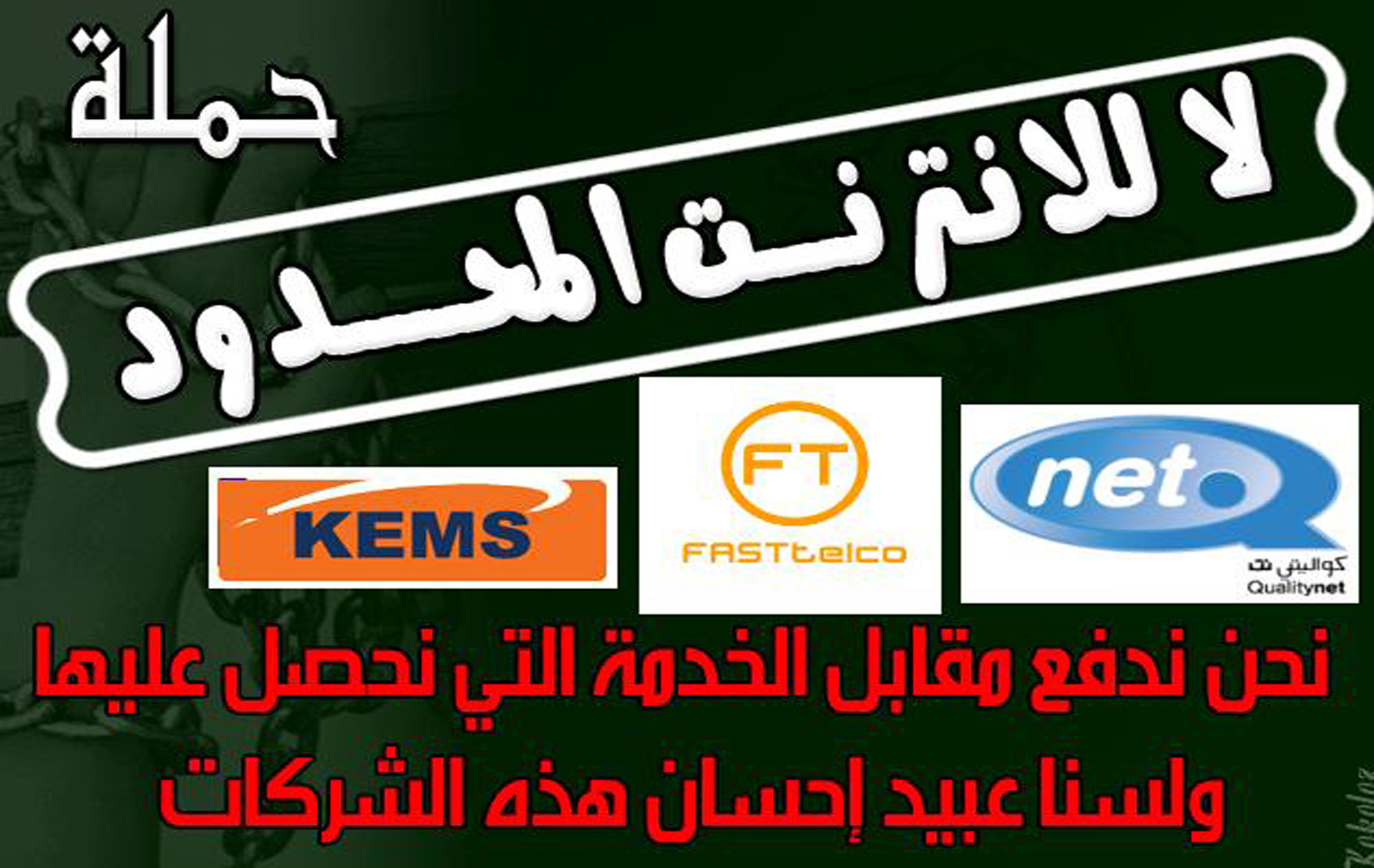 قررنا انا و الاخوه والأخوات المدونين الكويتيين القيام بحملة ضد الانترنت المحدود , وبما انه زمن الثورات قررنا القيام بثورة انترنتية ضد الانترنت المحدود تحت حجة “الاستخدام العادل ” فنحن المدونين نرفض رفضا تاما القيام بمثل هذه الممارسات اللتي تسلب من المشترك او المستخدم حرية استخدام للانترنت بالشكل المتعارف عليه في كل دول العالم , نحن ندفع في الكويت اسعار خيالية من اجل توفير خدمة انترنت ذات استخدام عادل بكل ماتحمله الكلمة من معنى , فالأستخدام العادل معناه ان يكون الانترنت غير محدود وغيرد مقيد بحجم ما , ولايجب ان افوت الفرصه للحديث عن ارتفاع اسعار الانترنت في دولة الكويت , فالاسعار هنا فعلا خيالية ومبالغ فيها , والمقابل خدمة محدوده جدا وغير عادلة للاسف نحن في زمن الانترنت وفي عام ٢٠١١ لايكاد يوجد شخص في الكويت الا ويستخدم الانترنت , وقد دخل الانترنت في جميع الاشياء سواء الهواتف النقالة والكمبيوترات وحتى الاتصالات اليومية والمراسلات بين الاشخاص , فمن هنا نعلن نحن المدونين الكويتيين عن رفضنا القطعي والتام لما يسمى بالانترنت المحدود